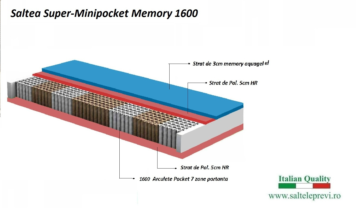 Spuma vasco-elastica memory reactioneaza la greutatea si caldura corpului oferind suport pe toata perioada somnului. In acest tip de saltea, arcurile sunt, de fapt, plasate Intr-un sac si sunt total independente unul de altul, producand un efect mai ergonomic, care insoteste organismul in fiecare miscare, fara nici o compresie. Sunt impartite în 7 zone diferite de portanta, cu o ergonomie totala si o adaptare completa la orice miscare a corpului. Acest lucru va asigura un suport anatomic adecvat, precum si o relaxare musculara ideala. Intr-o saltea matrimoniala 180/200 se regasesc circa 1600 arculete, iar intr-o saltea single circa 800 arculete.